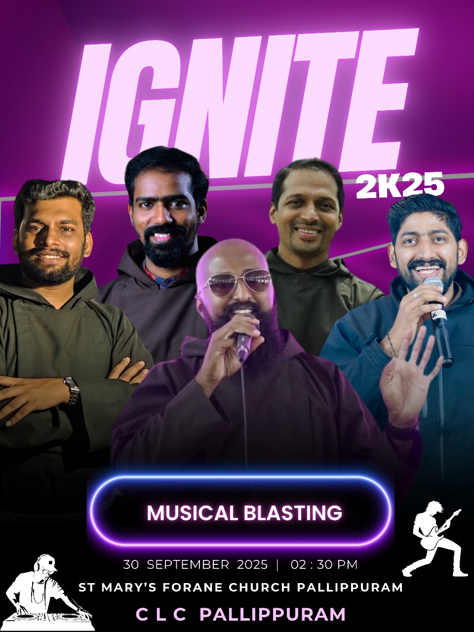 സ്നേഹം നിറഞ്ഞ യുവജനങ്ങളെ സെപ്റ്റംബർ 30 ചൊവ്വാഴ്ച വൈകിട്ട് 02:30 മണി മുതൽ പള്ളിപ്പുറം സി.എൽ.സി. യുടെ നേതൃത്വത്തിൽ യുവജനങ്ങൾക്ക് വേണ്ടി മ്യൂസിക്കൽ പ്രോഗ്രാം നടത്തുന്നു IGNITE 2K25. 8 ക്ലാസ്സ് മുതൽ ഉള്ള എല്ലാ യുവജനങ്ങളും പങ്കെടുക്കണമെന്ന് ഓർമിപ്പിക്കുന്നു