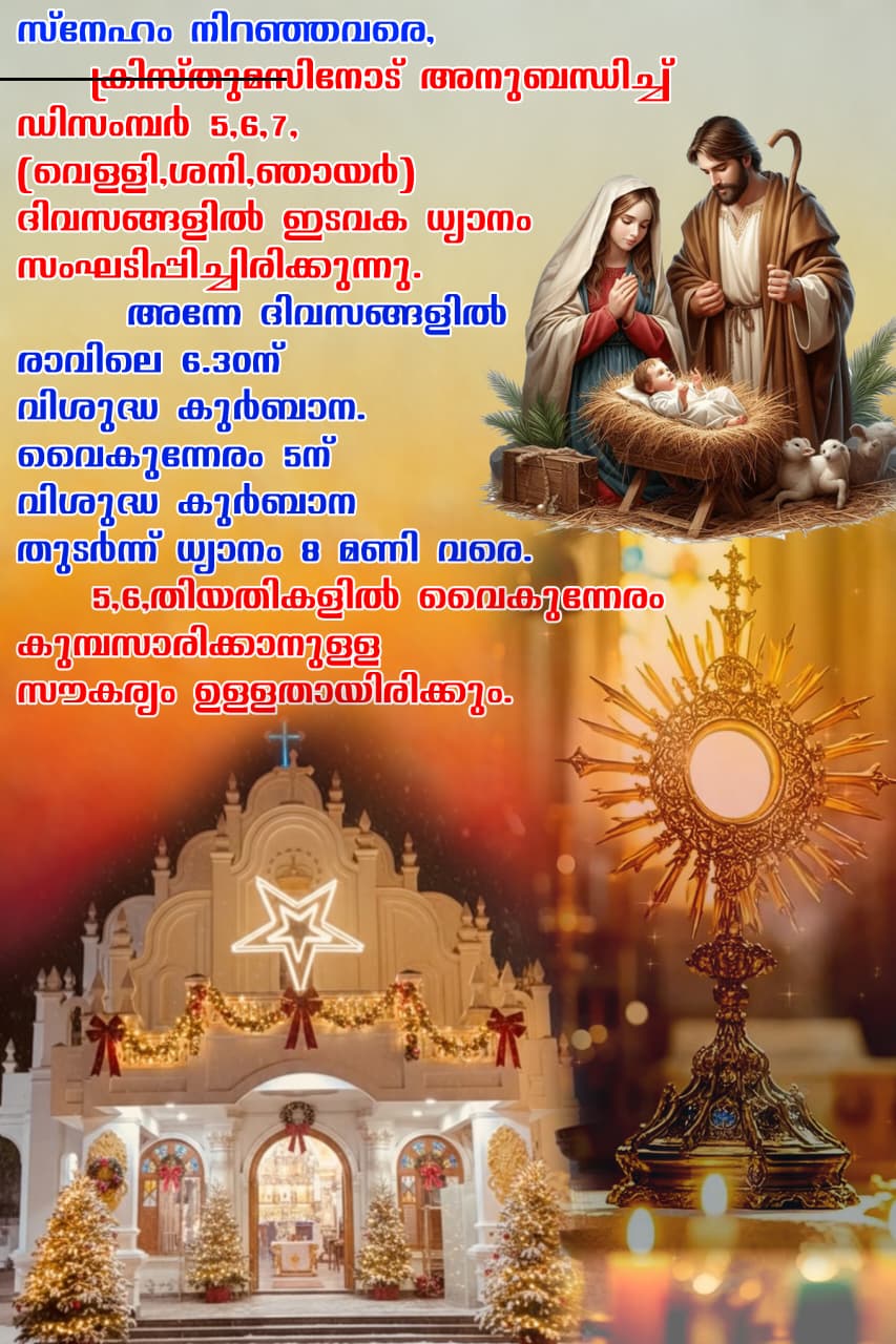 സ്നേഹം നിറഞ്ഞവരെ, ക്രിസ്തുമസിനോട് അനുബന്ധിച്ച് ഡിസംബർ 5, 6, 7 (വെള്ളി, ശനി, ഞായർ ) ദിവസങ്ങളിൽ ഇടവക ധ്യാനം സംഘടിപ്പിച്ചിരിക്കുന്നു. അന്നേ ദിവസങ്ങളിൽ രാവിലെ 6:30 ന് വിശുദ്ധ കുർബാന. വൈകുന്നേരം 5 മണിക്ക് വിശുദ്ധ കുർബാന തുടർന്ന് 8 മണി വരെ ധ്യാനം (8 മണി വരെ). 5-ാം തീയതിയും 6-ാം തീയതിയും വൈകുന്നേരം കുമ്പസാരിക്കുന്നതിനുള്ള സൗകര്യം ഉണ്ടായിരിക്കുന്നതാണ്. 5-ാം തീയതി വെള്ളിയാഴ്ച വൈകുന്നേരം കേളമംഗലം പള്ളിയിൽ വിശുദ്ധ കുർബാന ഉണ്ടായിരിക്കുന്നതല്ല. 7-ാം തീയതി ഞായറാഴ്ച വൈകുന്നേരം ഒറ്റപ്പുന്ന പള്ളിയിൽ വിശുദ്ധ കുർബാന ഉണ്ടായിരിക്കുന്നതല്ല. പകരം പള്ളിപ്പുറം പള്ളിയിൽ വൈകുന്നേരം 5-മണിക്ക് വിശുദ്ധ കുർബാന ഉണ്ടായിരിക്കുന്നതാണ്. 7-ാം തീയതി ഞായറാഴ്ച്ച കുടുംബയോഗങ്ങൾ ഉണ്ടെങ്കിൽ വൈകുന്നേരം 4:30ന് മുൻപ് തീർക്കാനായി ശ്രമിക്കുമല്ലോ. എന്ന് വികാരിയച്ചൻ.